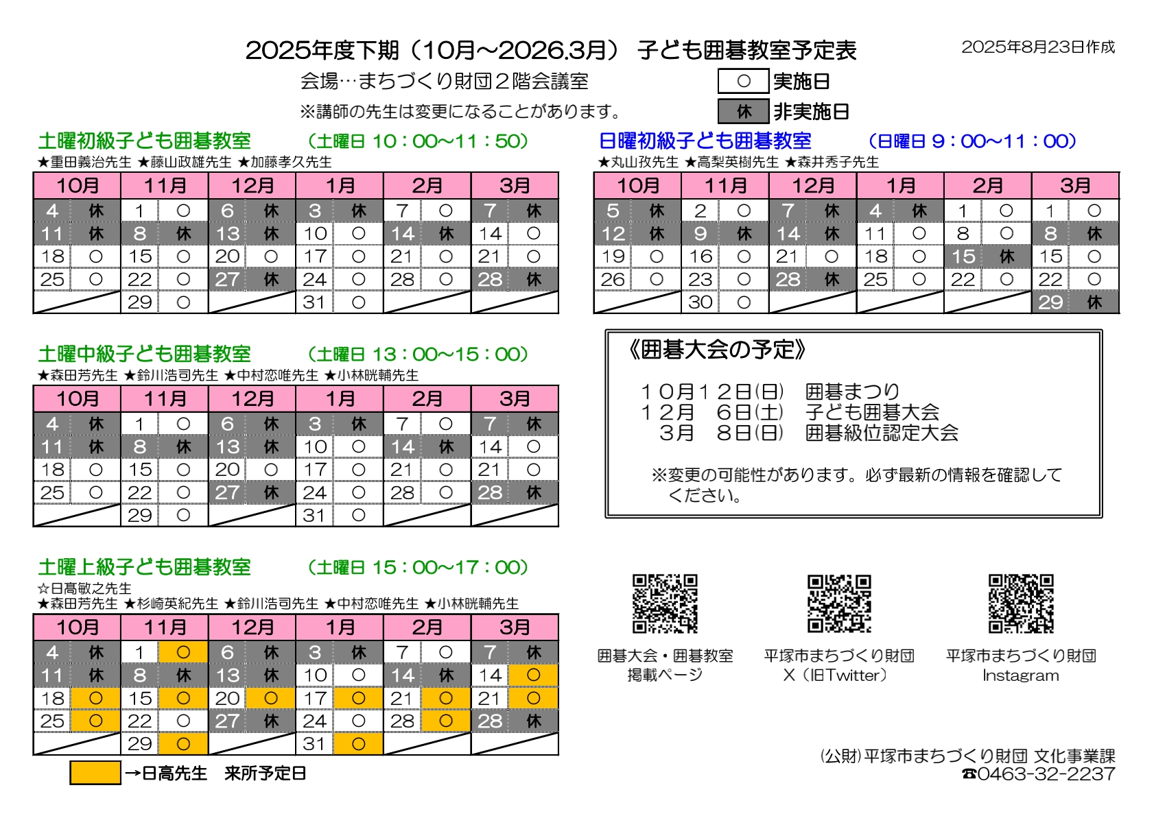 2025年度下半期(2025年10月〜2026年3月)の通年子ども囲碁教室の日程表を掲載しました。 -